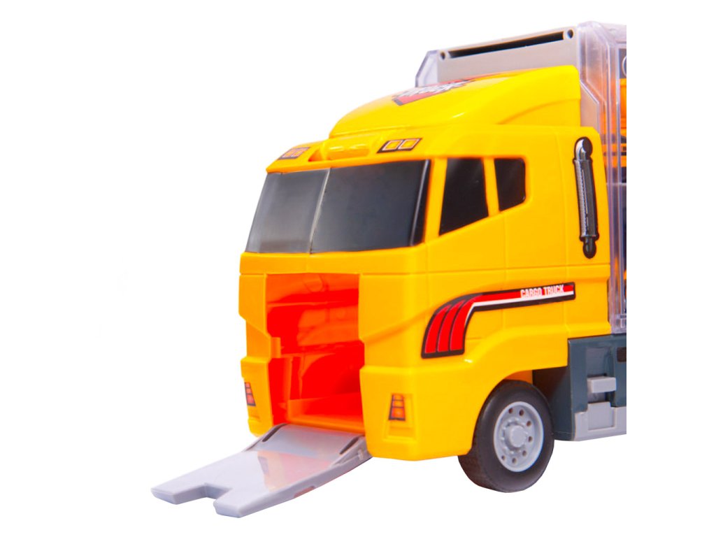 Velký nákladní automobil který umožňuje bezpečnou přepravu připojených malých vozidel.