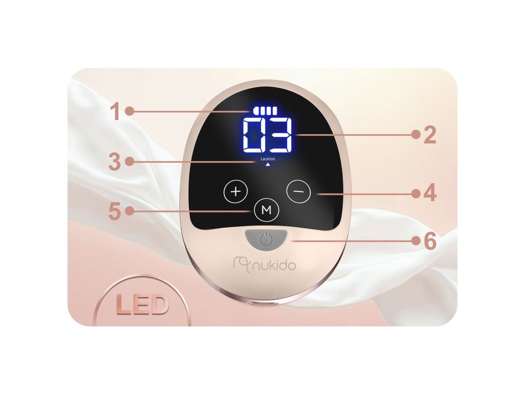 Odsávačka mateřského mléka Nukido je vybavena snadno čitelným lED displej který umožňuje používat zařízení v noci bez zapnutí světla. S ním můžete snadno nastavit jeho režim a správnou úroveň stimulace. Můžete také neustále sledovat úroveň nabití baterie.
