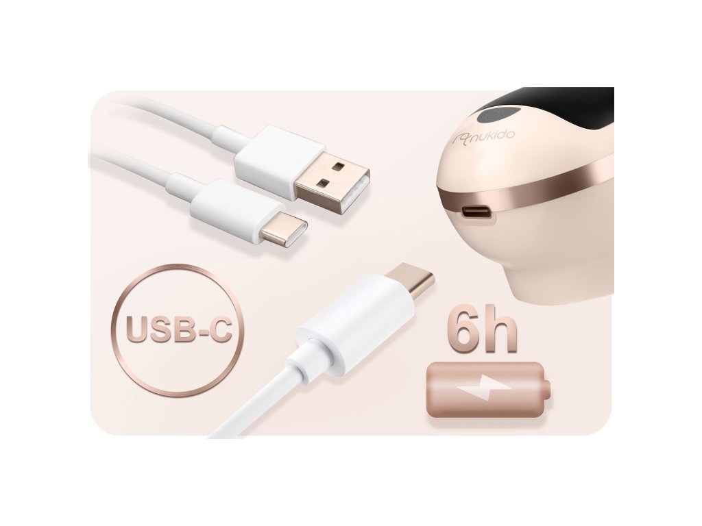 Odsávačka mateřského mléka Nukido funguje bezdrátově. Je vybavena lithiovou baterií, která po nabití umožňuje6 hodin používání a nabíjí se pomocí dodané nabíječky USB-C.