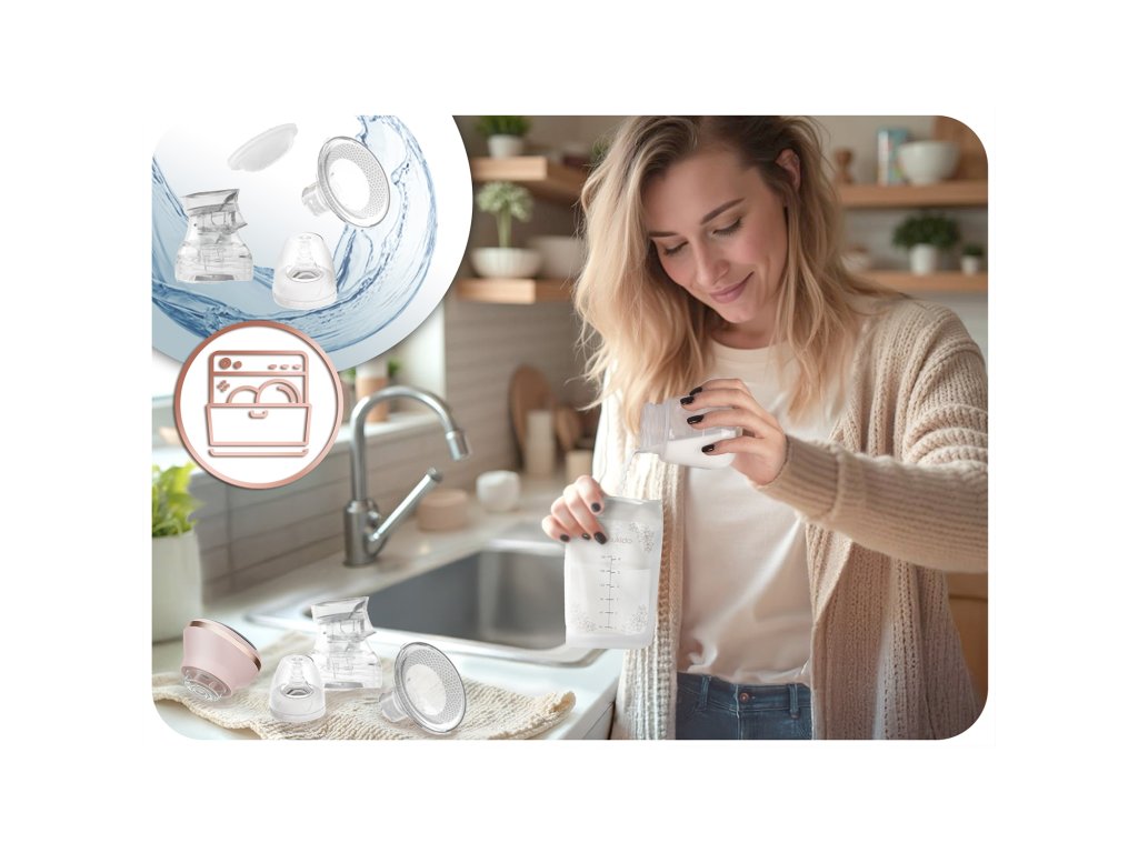 Součásti odsávačky lze mýt v myčce nádobí (kromě elektrického panelu)! Materiály odsávačky jsou antibakteriální a snadno se čistí.