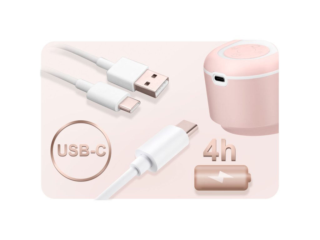 Odsávačka mateřského mléka Nukido funguje bezdrátově. Je vybavena lithiovou baterií, která po nabití umožňuje 4 hodiny používání a nabíjí se pomocí dodané nabíječky USB-C.