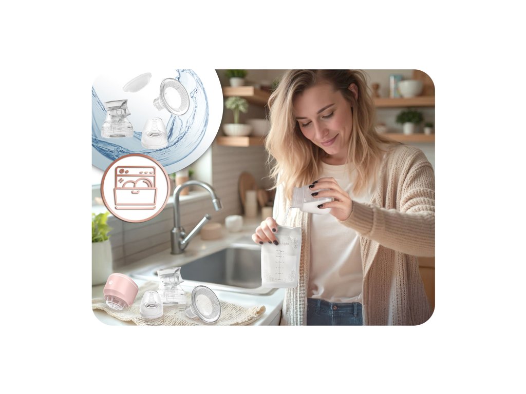 Součásti odsávačky lze mýt v myčce nádobí (kromě elektrického panelu)! Materiály použité na odsávačce mateřského mléka mají antibakteriální vlastnosti a zajišťují snadné čištění.