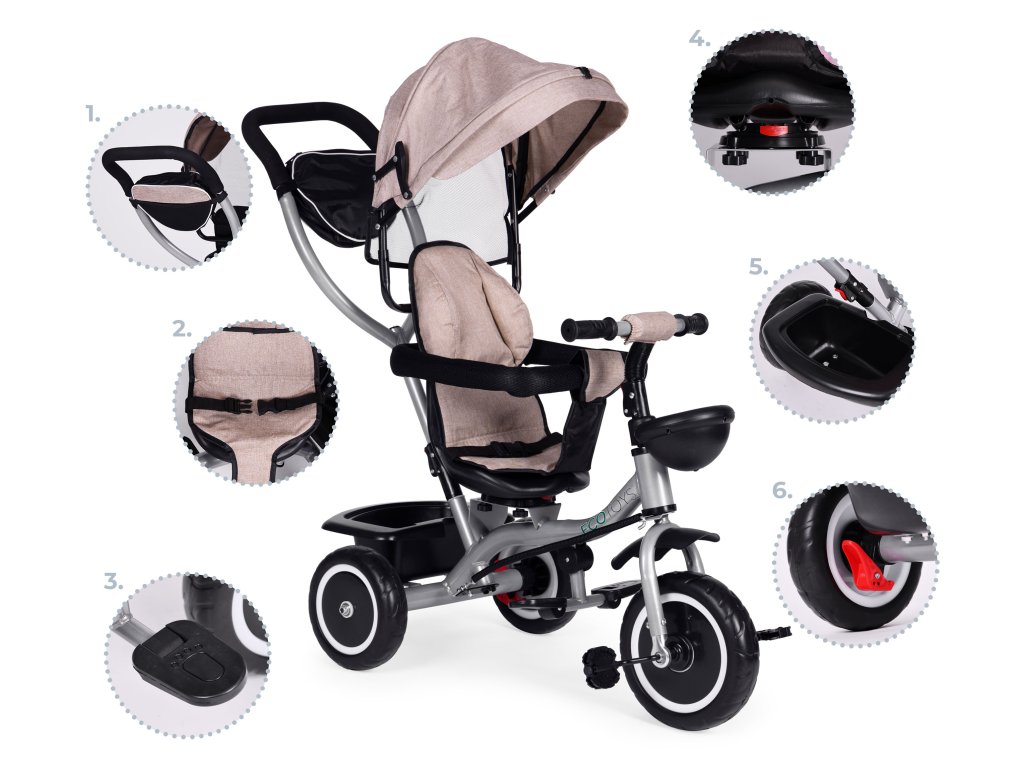 - Lze jej nakonfigurovat různými způsoby - kolo má možnost demontáže některých součástí, např. bezpečnostních zábran, stříšky nebo rukojeti řídítek. Tato funkce umožňuje přizpůsobit ji potřebám a schopnostem dítěte.