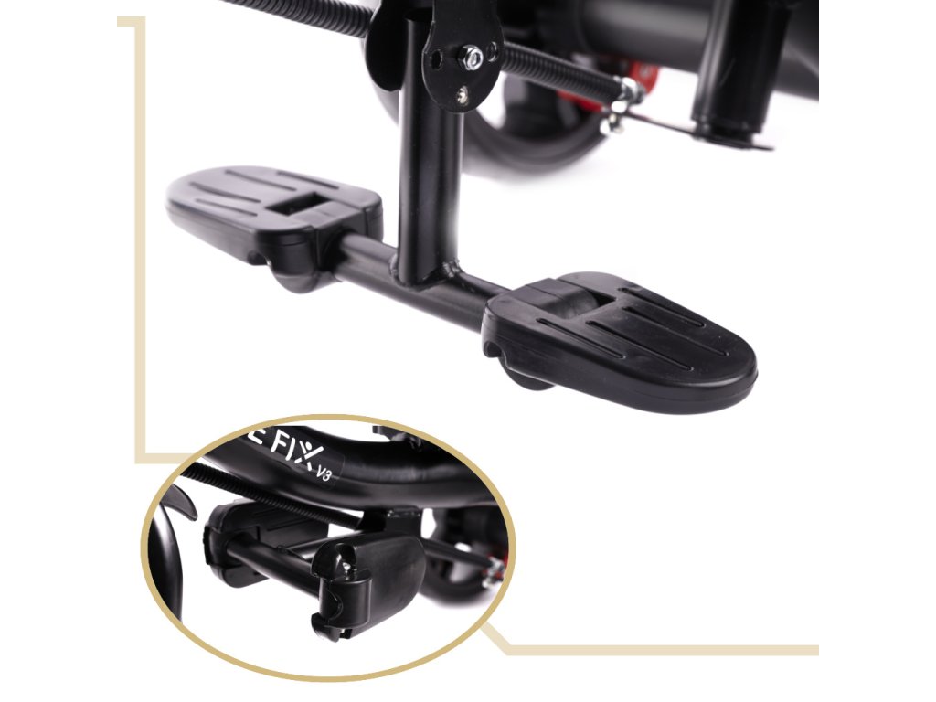Kolo je vybaveno skládací opěrky nohou pro menší děti, bezpečnost bezpečnostní pásy a bezpečnostní zábradlí . Opěrky nohou a bezpečnostní tyč lze odejmout, až bude vaše dítě o něco starší, začne se učit jezdit a dosáhne na řídítka a pedály na předním kole.