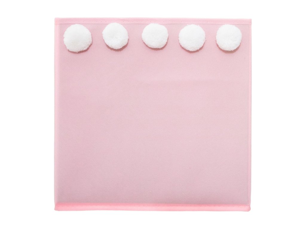 Design plný jednoduchosti tohoto úložného prostoru do dětského pokoje dodá místnosti nádech strohosti, bambulky dodají celku jemnost.