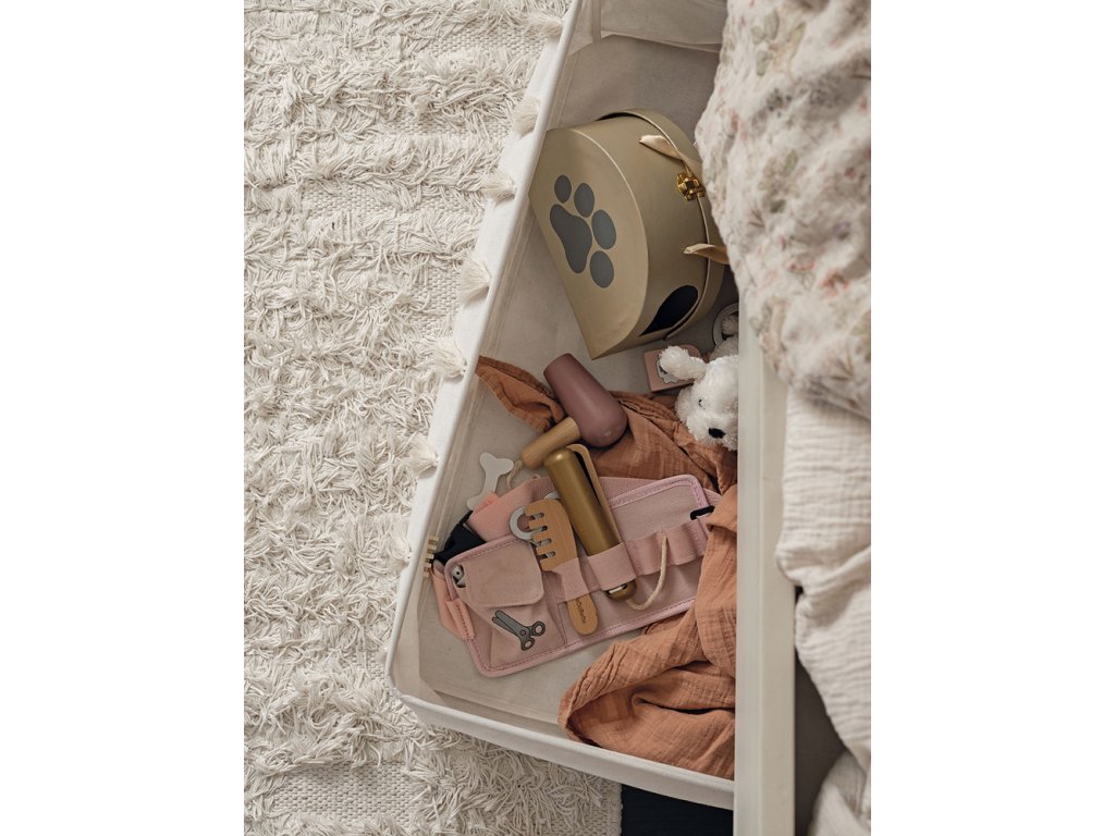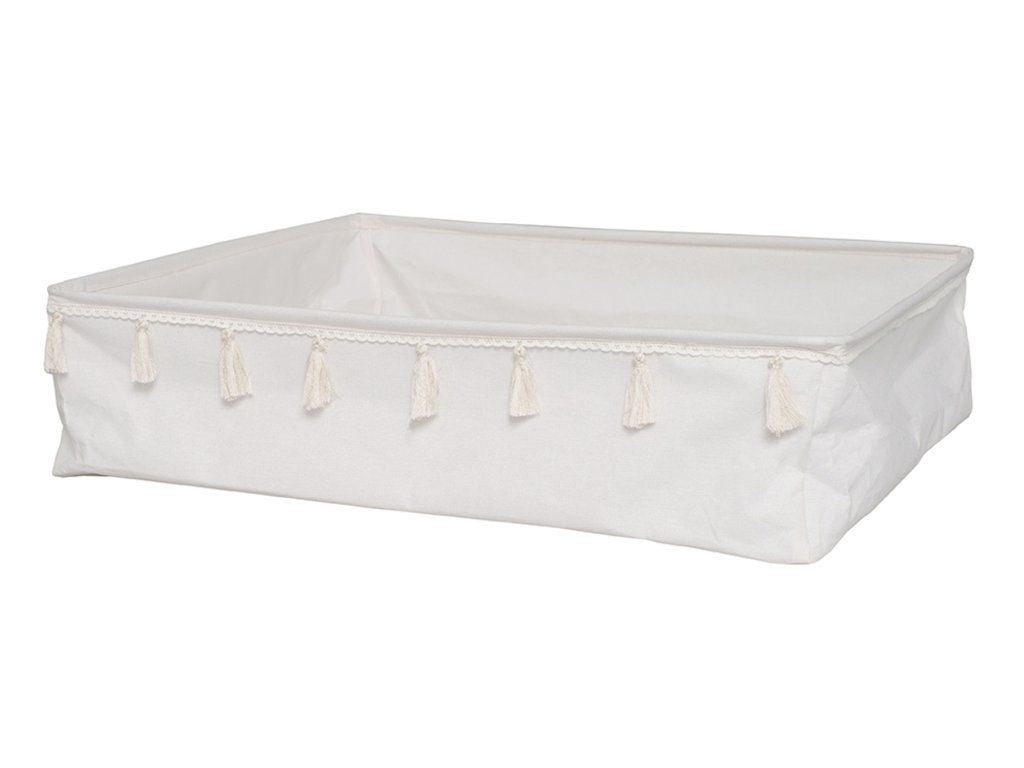 Tato praktická úložná jednotka má ideální tvar a velikost, aby se vešla pod postel. Je vyroben z polyesteru a bavlny a je k dispozici ve dvou různých barvách. Úložný prostor umožňuje snadné třídění, uspořádání a uložení, takže se nebudete muset stresovat při úklidu. Například ukládání oblečení nebo hraček pod postelí je nyní snadné a stylové. Když úložný prostor u postele nepoužíváte, lze jej jednoduše stlačit a zabírá méně místa. Jednu stranu úložného prostoru zdobí krásné střapce, takže je ideální směrem ven.