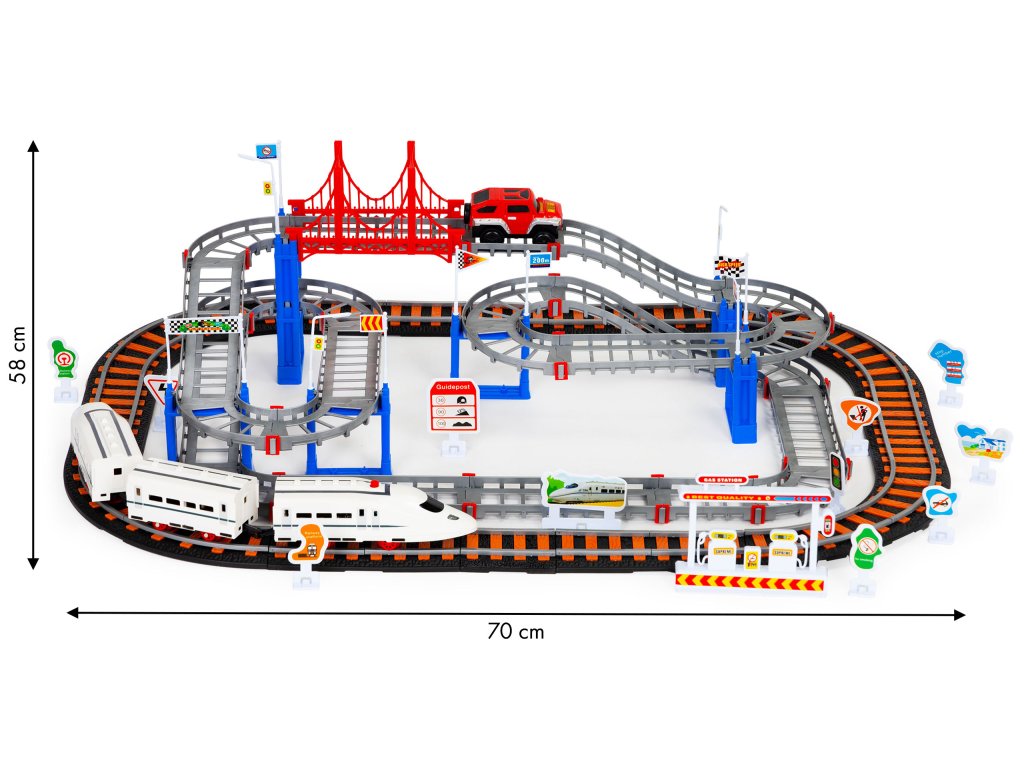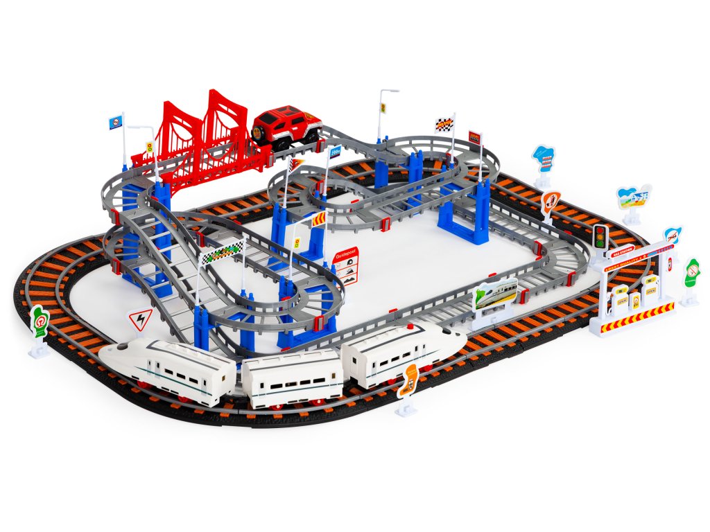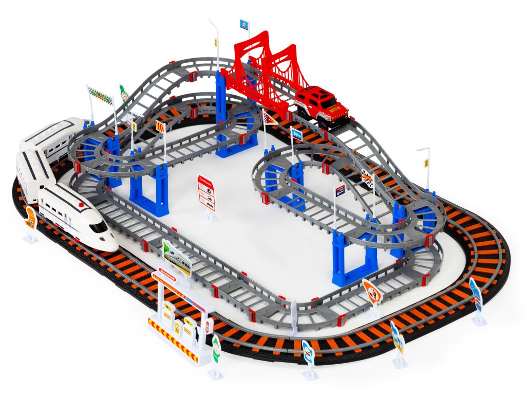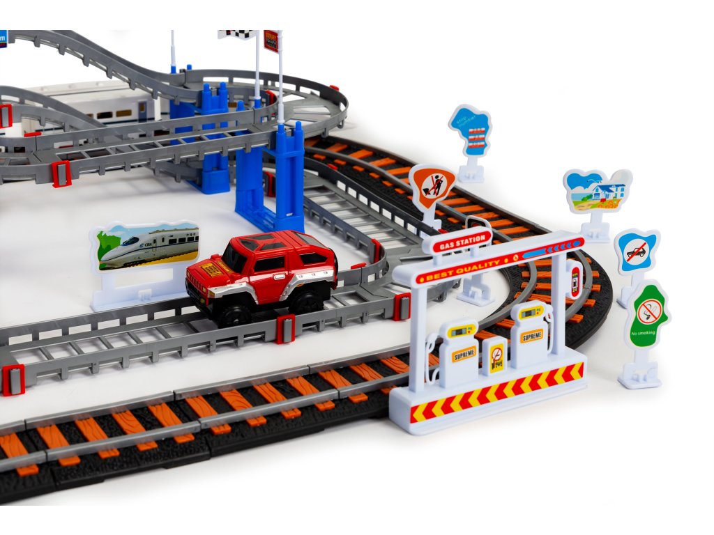 Dvě samostatné dráhy jsou opravdovou lahůdkou pro děti, které rády staví a hrají si s vozidly. Sada se skládá z kolej pro železnici a druhá, vícepatrová kolej, po které se pohybuje terénní vozidlo. Všichni se budou skvěle bavit propojení kolejí, to umožňuje vytvořit pokaždé jinou trasu.