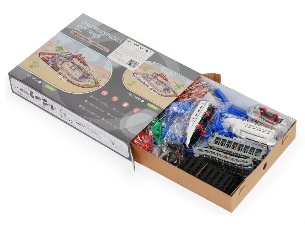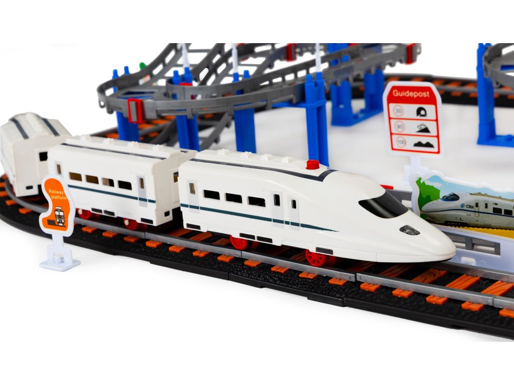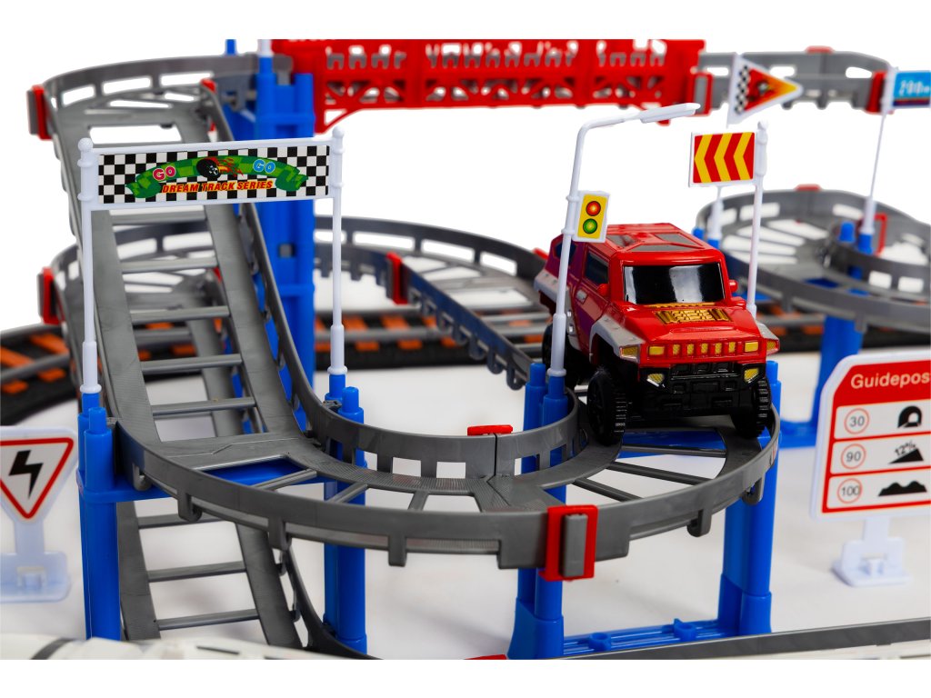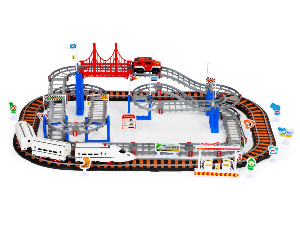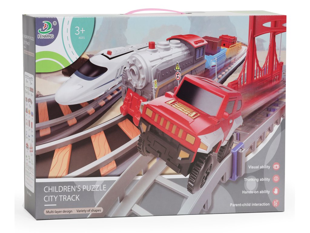 Dvě samostatné dráhy jsou opravdovou lahůdkou pro děti, které rády staví a hrají si s vozidly. Sada se skládá z kolej pro železnici a druhá, vícepatrová kolej, po které se pohybuje terénní vozidlo. Všichni se budou skvěle bavit propojení kolejí, to umožňuje vytvořit pokaždé jinou trasu.