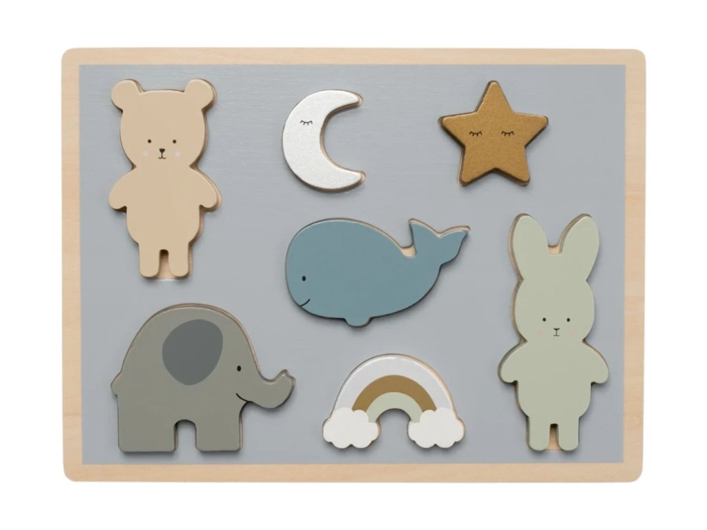 Rozvíjející se dřevěné puzzle se 7 různými vkládacími dílky. Ideální pro trénink jemné motoriky a zábavu. Bezpečné, certifikované podle evropských norem. Rozměry: 1,7 x 30 x 22,5 cm.