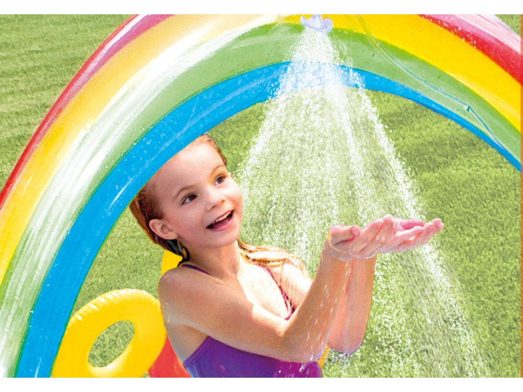 Raj počas horúceho dňa? Jednoducho pripojte štandardnú záhradnú hadicu k ventilu namontovanému v bazéne vytvoriť ideálne podmienky na ochladenie v lete. Fontána je namontovaná nad šmýkačkou v dúhovej obruči aby každá snímka je extra ochladenie.