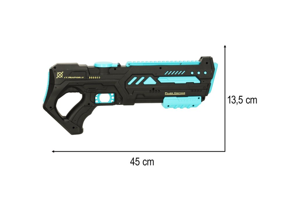 ● Materiál: ● Barva: ● Rozměry: ○ Délka: 45 cm ○ Šířka: 5,5 cm ○ Výška: 13,5 cm ○ Výška rukojeti: 18,5 cm ● Hmotnost: 534 g ● Hmotnost s kartonem: 703 g ● Objem nádržky na vodu: 1,5 l: 200 ml ● Dosah střelby: Až 10 metrů ● Zvukové efekty: ● Zvukové efekty: Ano, se zvukem imitujícím salvu výstřelů ● Napájení: Nabíjení přes USB ○ Nabíjecí baterie: 7,4 V 500 mAh (součástí balení) ● Baterie: Není k dispozici ● Mechanismus: Spoušť, tlak - stisknutím tlačítka vystřelíte vodu ● Doporučený věk: Děti starší 6 let. rozměry: 45,5 cm x 20 cm x 6 cm ● K dispozici také v bílé barvě
