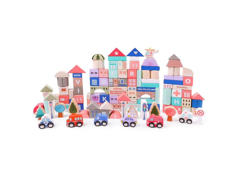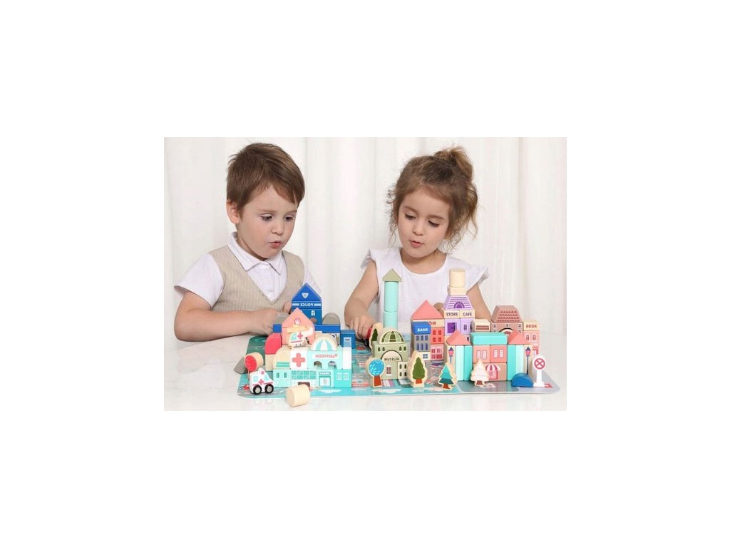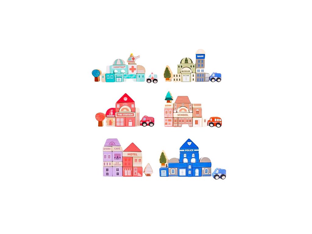 Sada dřevěných bloků vám umožní postavit velké město, které zahrnuje budovy, jako jsou: hotel, nemocnice, banka, policejní stanice, škola a dokonce i hasičská stanice. Každá budova byla navržena s využitím mnoho informací, což umožňuje rozpoznat jeho funkci.