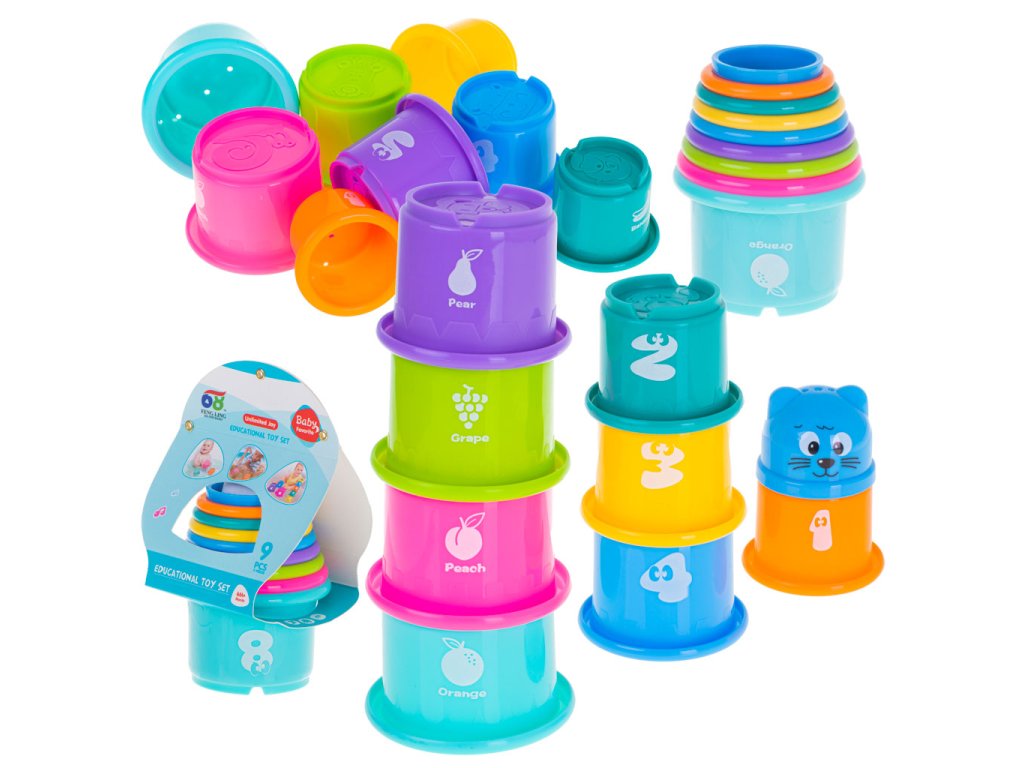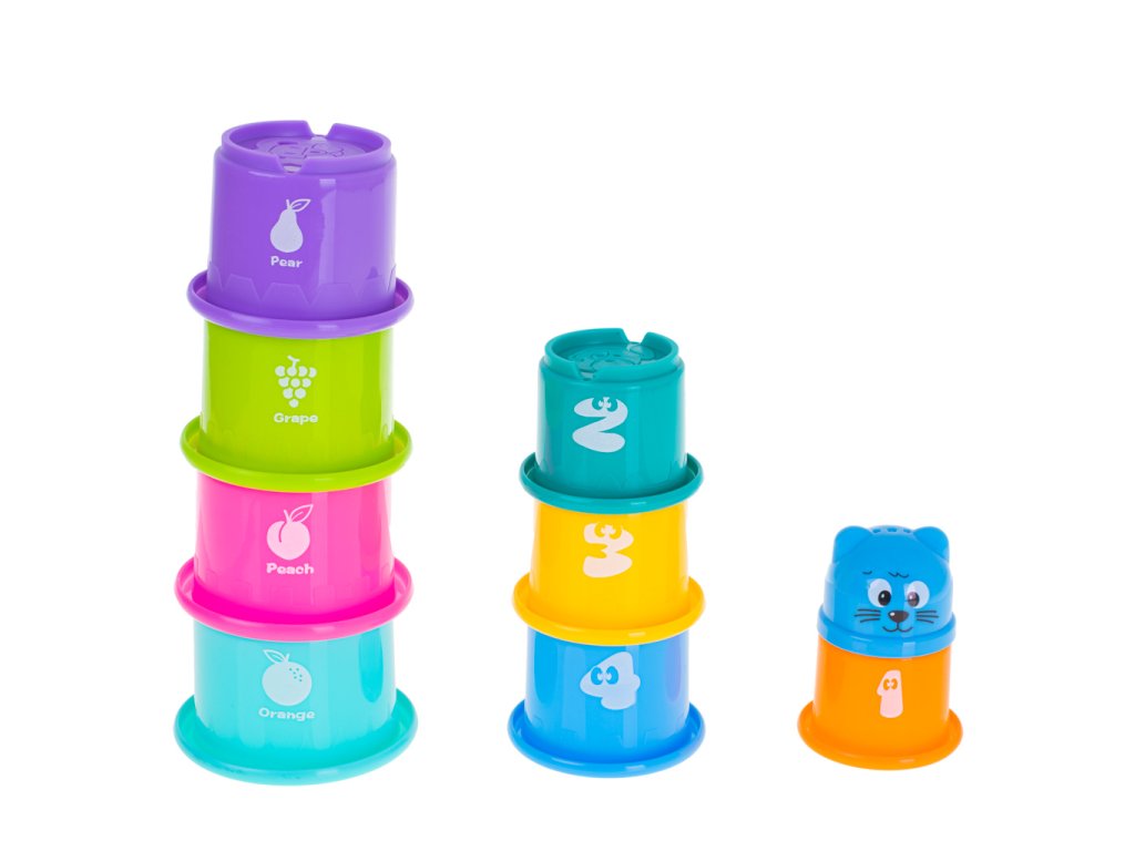 Učební kelímky Věž Pyramida Čísla a ovoce - zábavná hra, která rozvíjí manuální dovednosti a kreativitu dětí. Díky barevným kelímkům a obrázkům učí čísla, barvy a ovoce. Vhodné pro hraní doma, venku i na pláži. Ideální dárek pro malé objevitele. Materiál: odolný plast. sada obsahuje 9 kelímků, věž o rozměrech 8 cm x 38,2 cm.