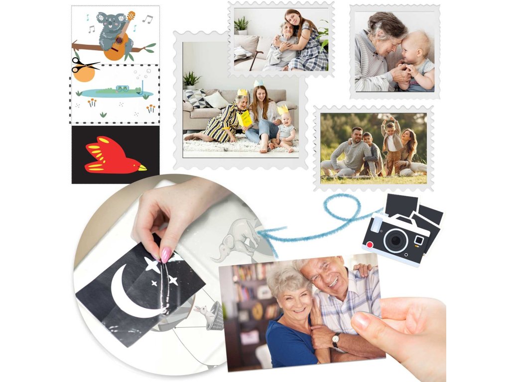 Pevne všité vrecká do ktorého vložíte fotografie, kresby alebo obrázky podľa vlastného výberu. Dostanete 4 ilustrácie, ktoré môžete vystrihnúť z obalu - ekológia a praktickosť v jednom.