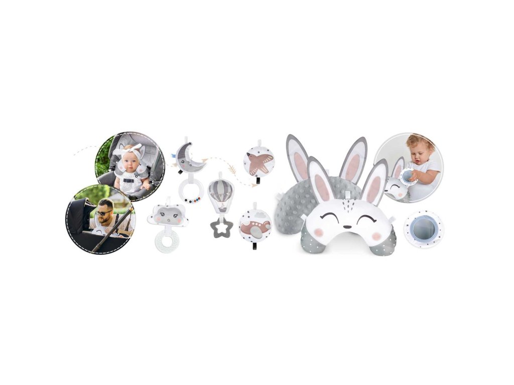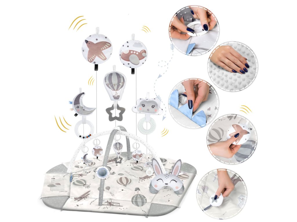 Preto sme do balenia zahrnuli multifunkčné hračky, ktoré môžete zavesiť na podložku - nech niečo cinká, zvoní a šuští! Hračky dokonca obsahujú aj pískacie hračky - vtáčika a hviezdu!