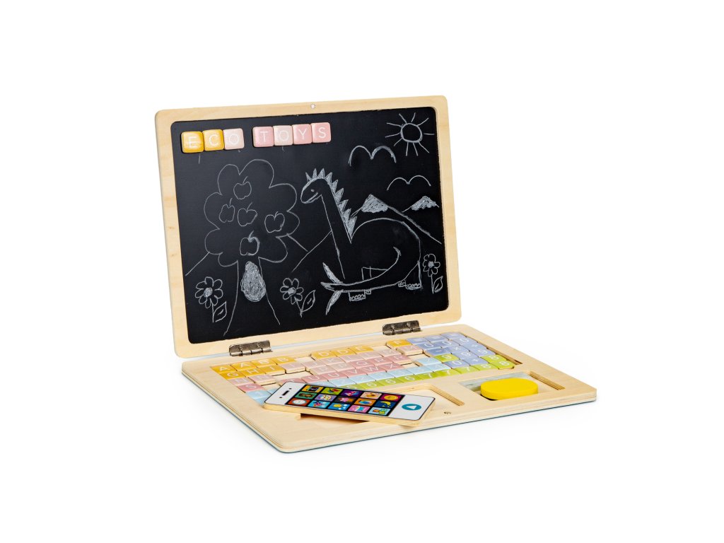ECOTOYS Výukový sešit pro děti od 3 let. Multifunkční hračka 2 v 1 se 78 barevnými písmeny a číslicemi. Rozvíjí kreativitu a dovednosti. S magnetickou tabulkou, křídou a houbičkou. Bezpečná dřevěná konstrukce. Ideální způsob, jak se učit hravou formou.