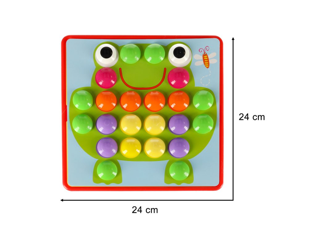 Zábava spočívá ve vkládání knoflíků do otvorů na obrázku ve správné barvě.