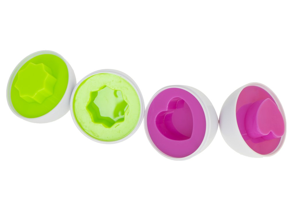 V sadě najdete 12 vajíček, která pod skořápkou skrývají různé tvary a barvy.