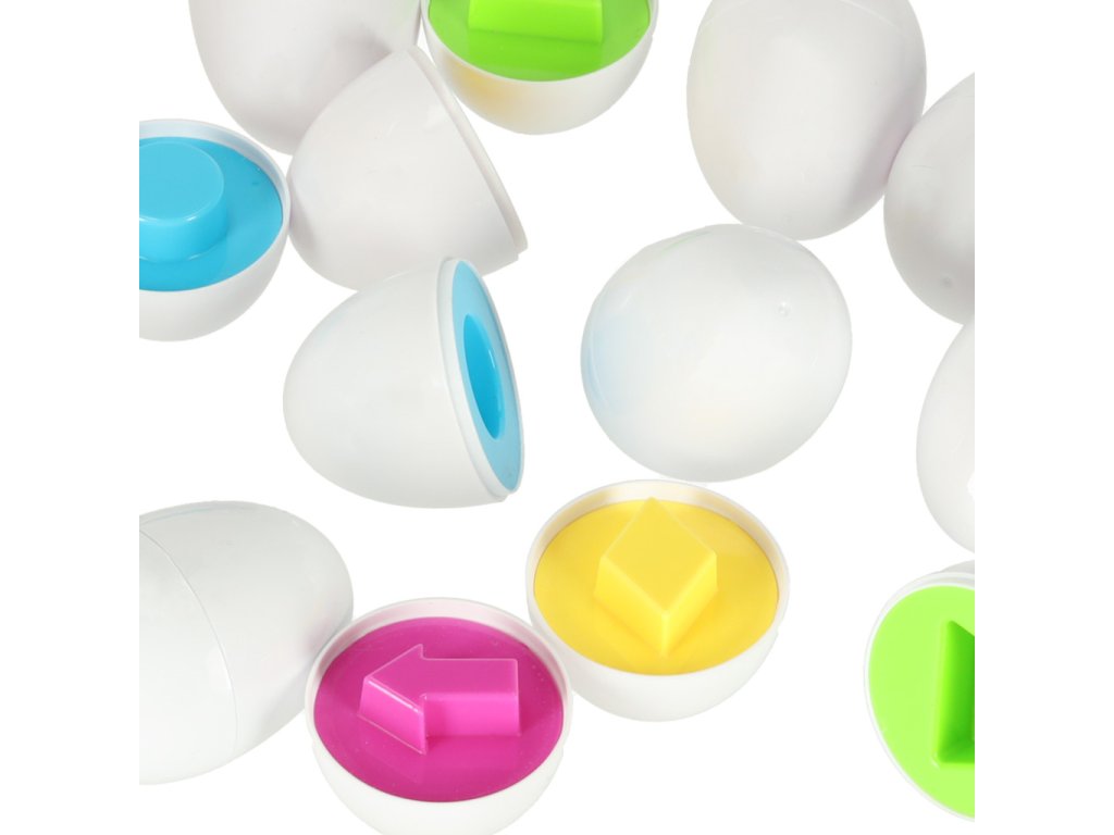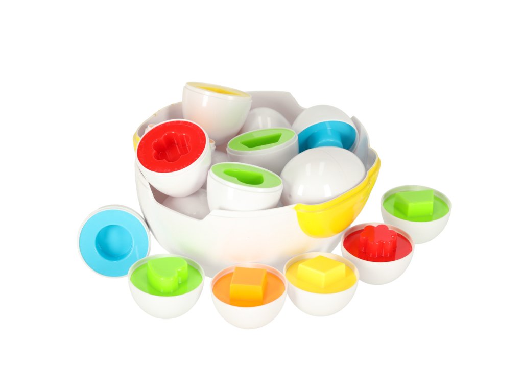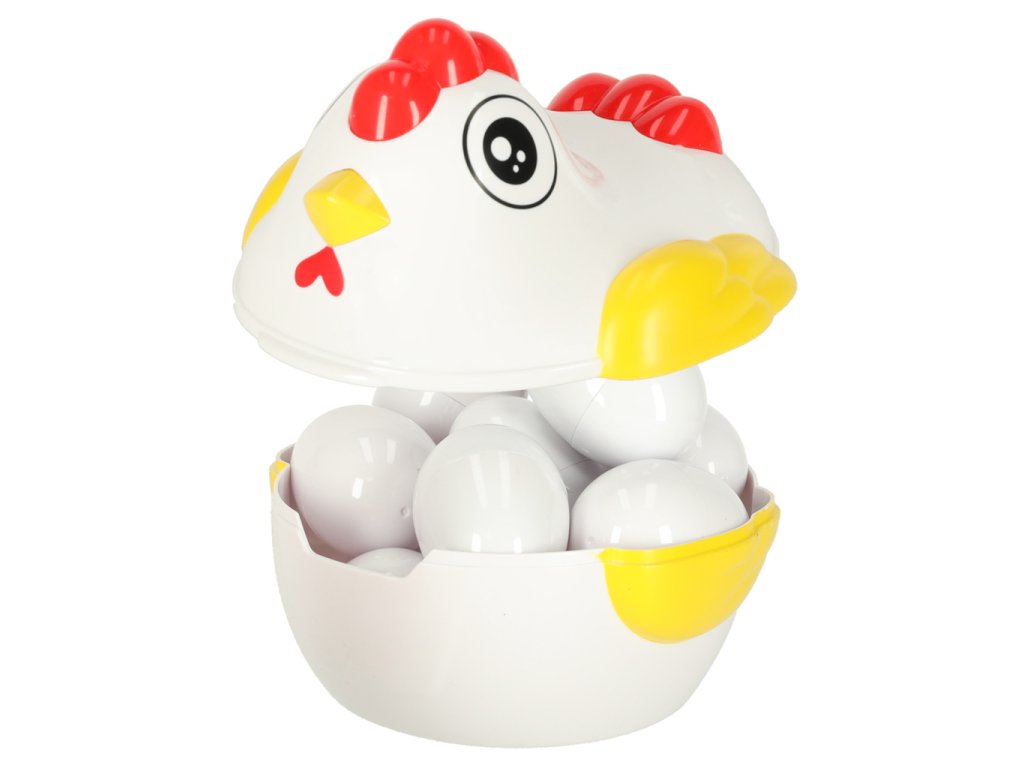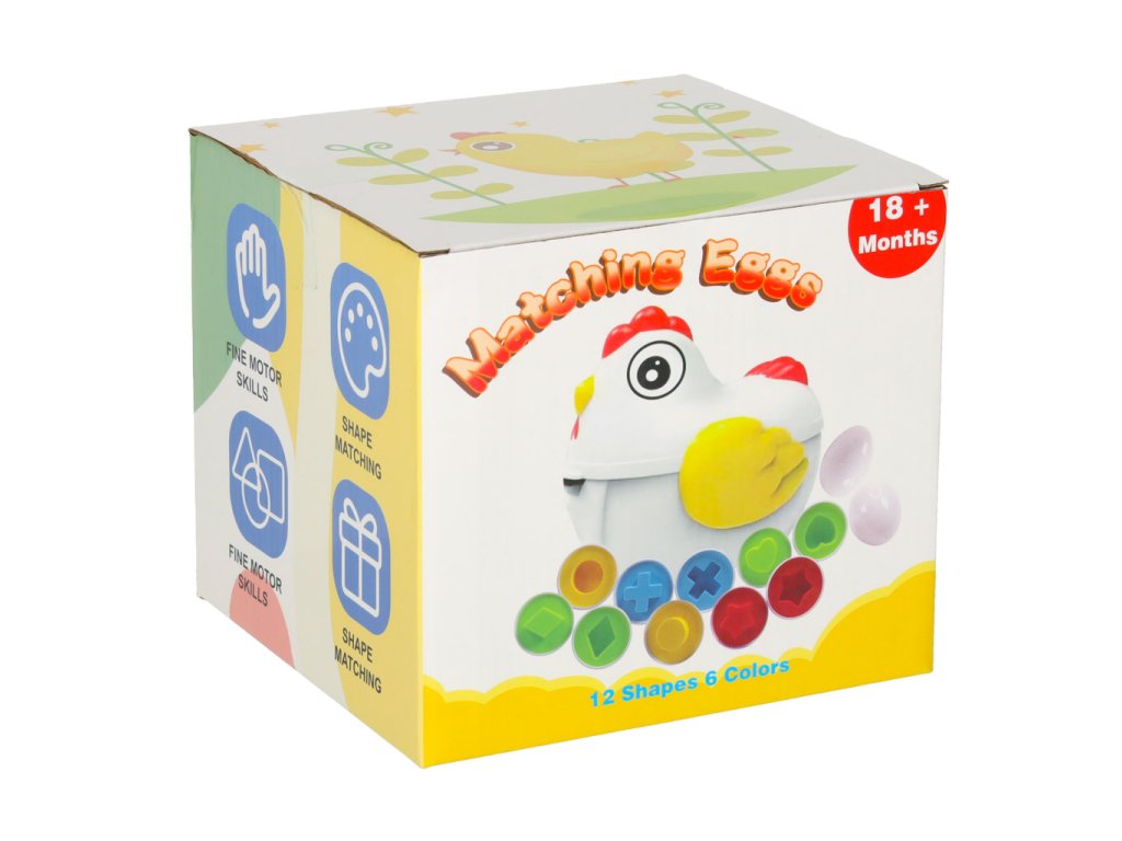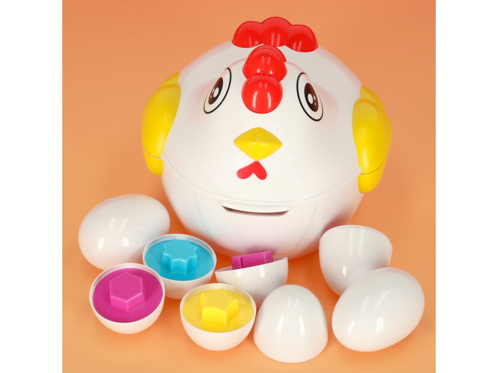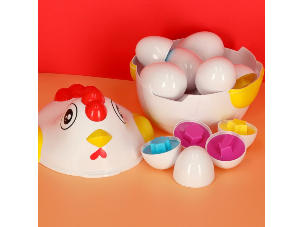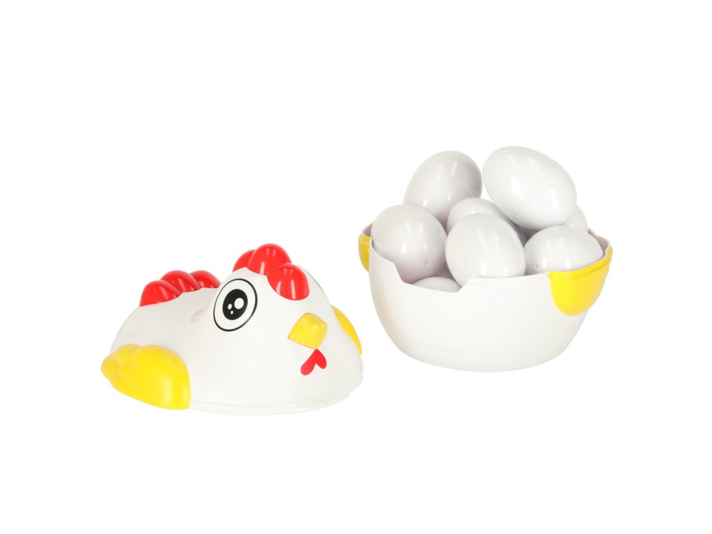 Uvnitř kurníku je 12 plastových vajec, která lze otevřít a znovu spojit. Uvnitř každého vajíčka je tvar, který se hodí pouze na jednu konkrétní polovinu. Úkolem dítěte je vajíčka rozházet, otevřít je a hledat správné dvojice, které k sobě tvarově a barevně patří.