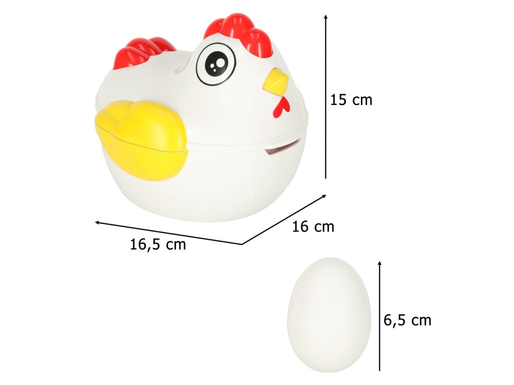 - Věk dítěte: 18m+- Barvy: bílá, žlutá, červená, zelená, modrá.. Rozměry nádoby (pekáče): 1,5 kg: 15 x 16 c x 16,5 cm- Rozměry otevřené nádoby: Rozměry : 7 cm x 16 c x 16,5 cm- Počet vajec: 12 ks - Rozměry vajec: 6,5 x 4,5 cm- Výrobek je zabalen v barevné krabici výrobce s rozměry: 17 x 16 x 15 cm