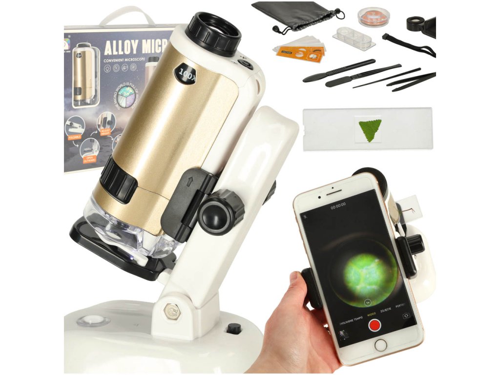 Prozkoumejte svět pomocí mikroskopu s maximálním zvětšením 250x! Balení obsahuje mikroskop, základnu, sklíčka, příslušenství pro odběr vzorků a držák na telefon. Ideální pro děti od 6 let. Baterie nejsou součástí balení.