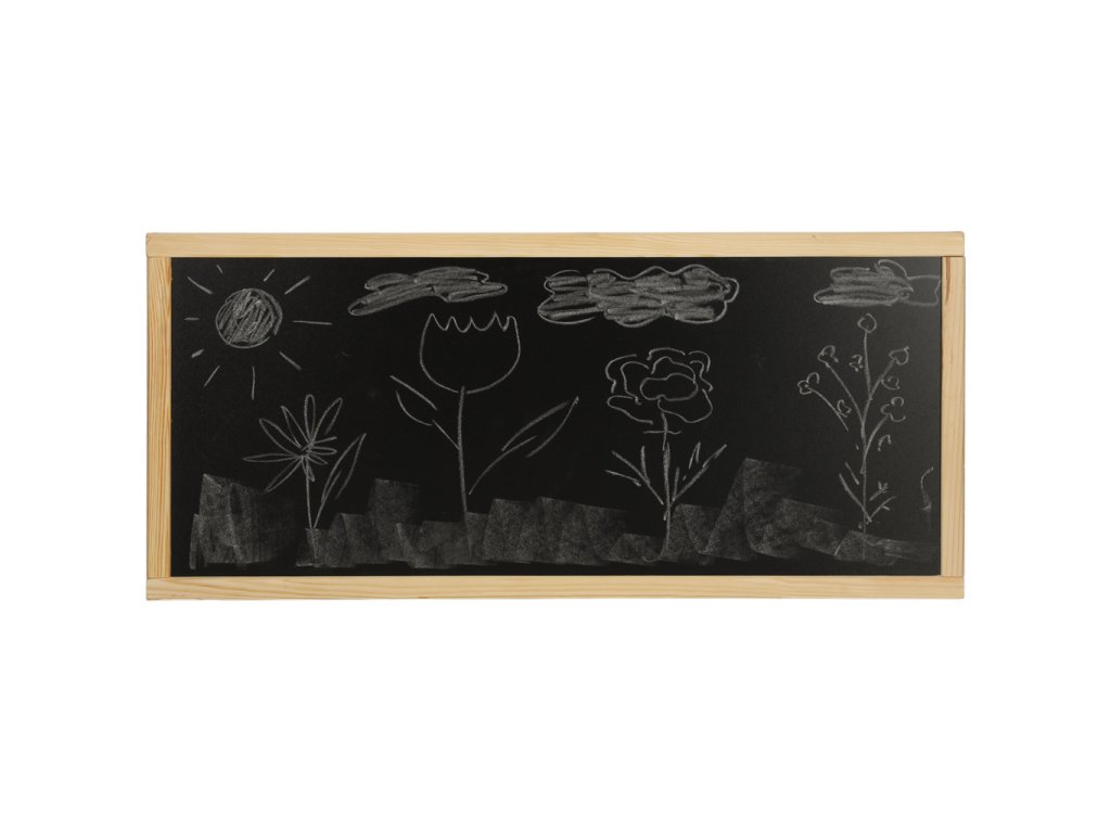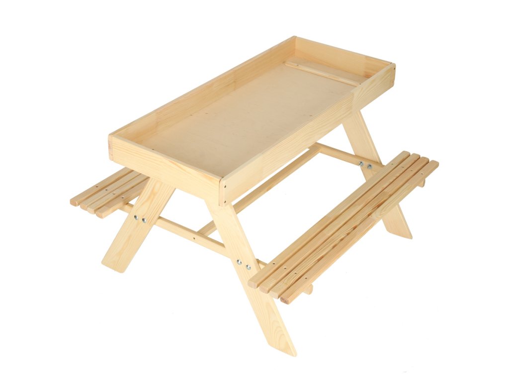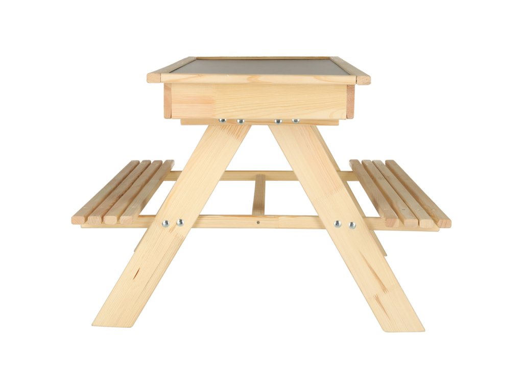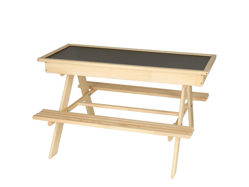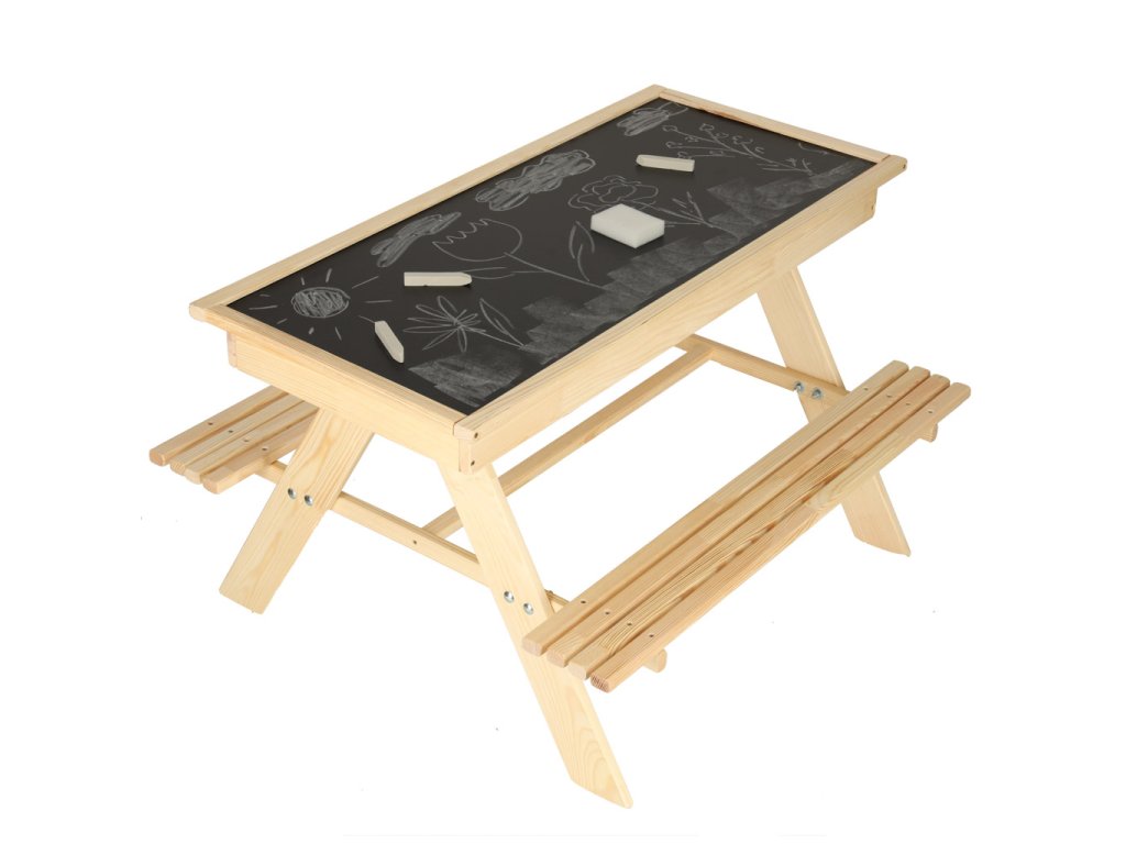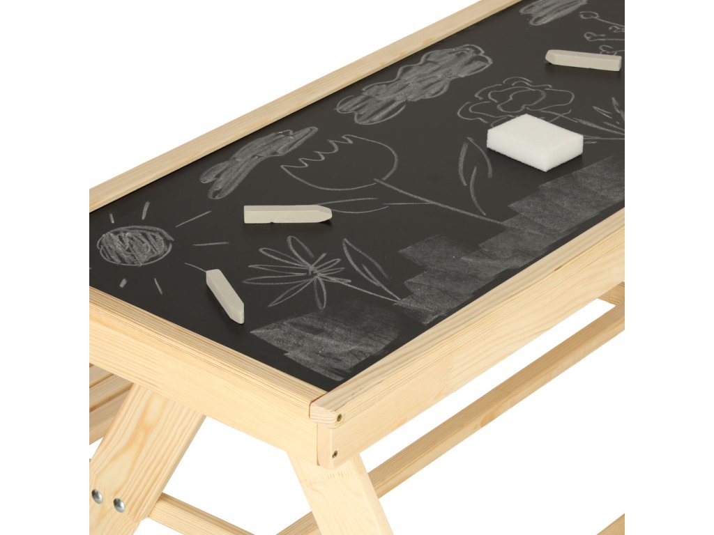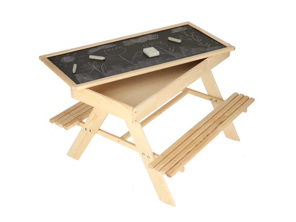 Dřevěný zahradní set obsahující stůl + 2 lavice a kontejner/úložný box/pískoviště a horní část jako tabuli na psaní křídou. Křídy a houba jsou součástí balení.
