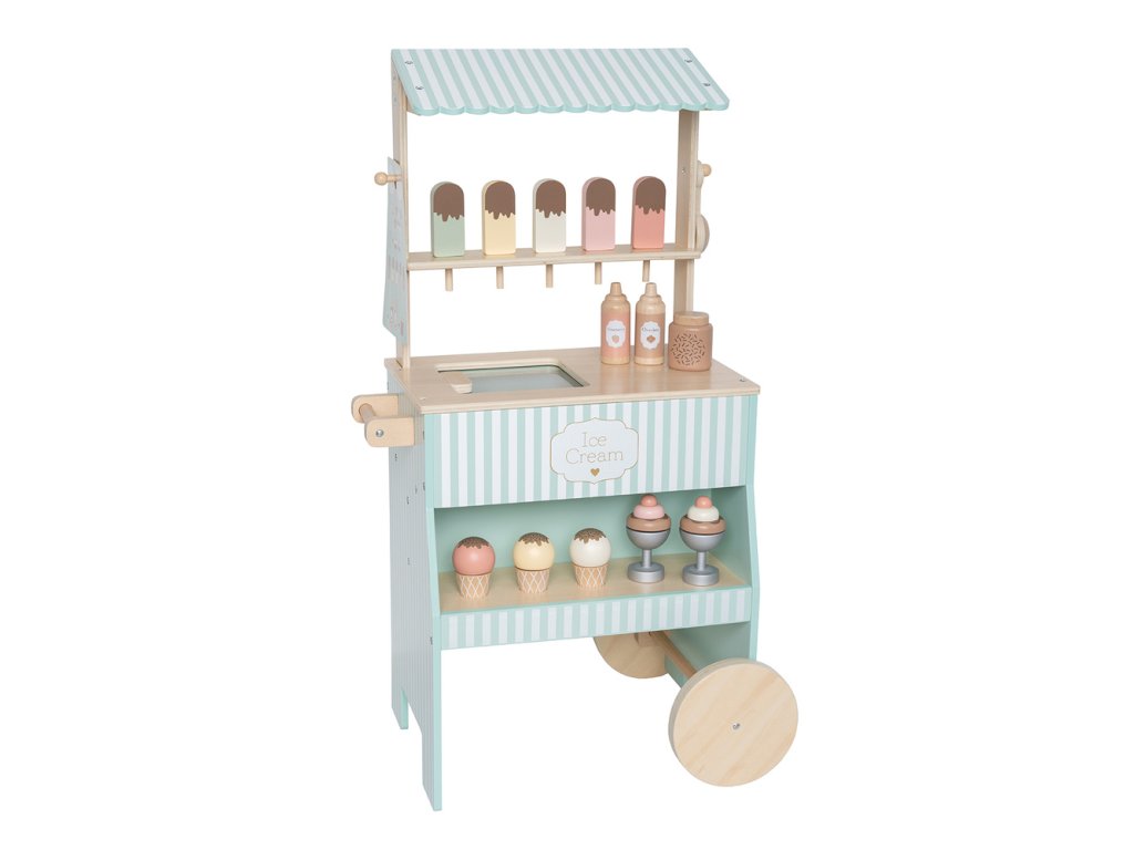 Okouzlující zmrzlinový vozík pro malé zmrzlináře! S klasickým modrobílým designem a vybavením pro výrobu lahodné zmrzliny a nanuků. S malou mrazicí částí, naběračkami na zmrzlinu a lahvičkami na polevy. S velkými koly pro snadné přemisťování. Obsahuje vše, co potřebujete k zábavě s příchutěmi, omáčkami a polevami. Vyrobeno ze dřeva s certifikací FSC™.